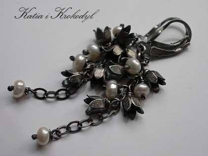 Kolczyki wykonane ze srebra [pr.925] w połączeniu z miniaturkami dzwoneczków [5mm] oraz naturalnymi, białymi perełkami [4mm]. Całość oksydowana i przetarta. Całkowita długość kolczyków 6,2cm. Biżuteria ozdobnie zapakowana.