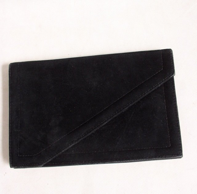 Czarna torebka-kopertówka.Materiał mięsisty syntetyk.Klapka ukośna,zapinana na zamek magnetyczny.Podszewka jasno beżowa.Dwie osobne przegrody+kieszonka na środku+mała z boku.Stan dobry+.Wysokość 17 cm.szerokość 27 cm.