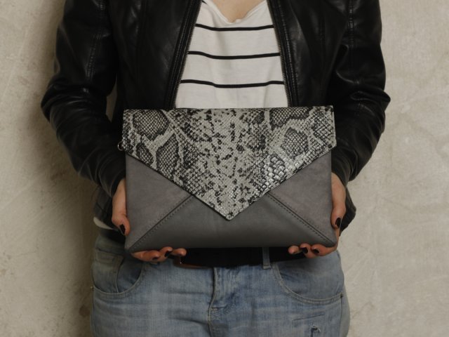 Torebka typu kopertówka została wykonana z zamszu typu alcantara w kolorze szarym oraz szarej i wężowej ekoskóry. W środku wykończona wzorzystą podszewką oraz mała kieszonka zapinana na zamek. Zapinana na zatrzask.