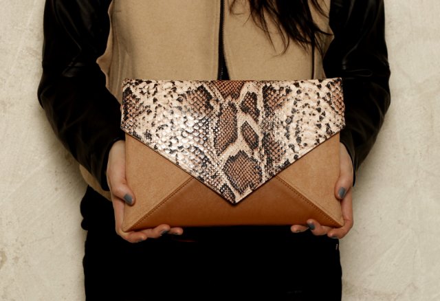 Torebka typu kopertówka została wykonana z zamszu typu alcantara w kolorze toffi oraz rudej i wężowej ekoskóry. W środku wykończona wzorzystą podszewką oraz mała kieszonka zapinana na zamek. Zapinana na zatrzask.