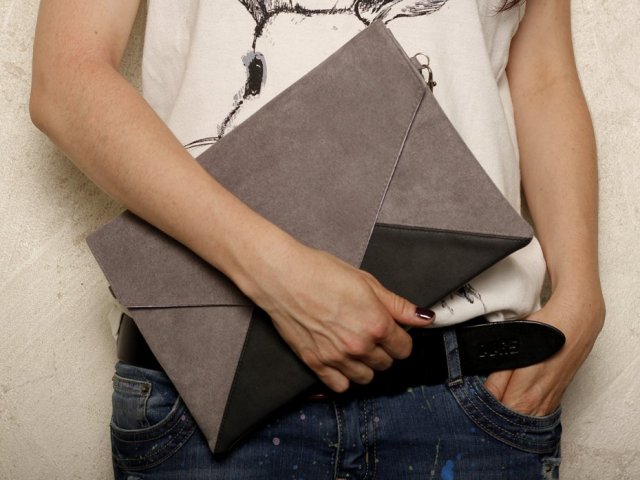 Torebka typu kopertówka została wykonana z szarego zamszu typu alcantara oraz czarnej przecieranej ekoskóry.