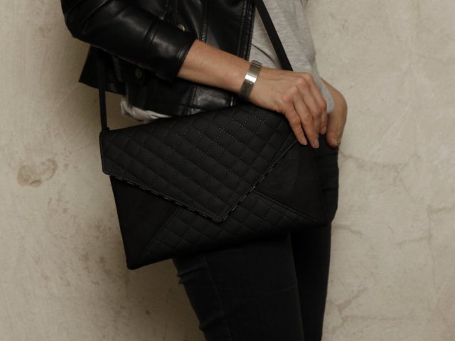 Torebka typu kopertówka została wykonana z zamszu typu alcantara w kolorze czarnym oraz czarnej pikowanej ekoskóry. W środku wykończona bawełnianą wzorzystą podszewką oraz mała kieszonka zapinana na zamek. Zapinana na zatrzask.Torebkę można nosić w ręce i na ramieniu. Wymiary: Wysokość: 22cm Szerokość: 29cm