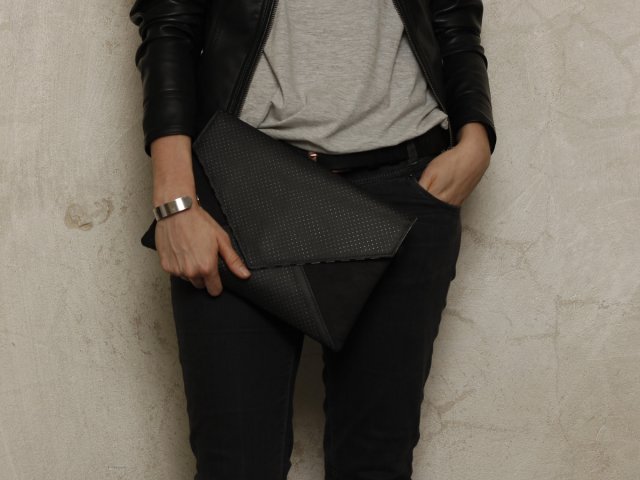 Torebka typu kopertówka została wykonana z zamszu typu alcantara w kolorze czarnym oraz czarnej perforowanej ekoskóry. W środku wykończona bawełnianą wzorzystą podszewką oraz mała kieszonka zapinana na zamek. Zapinana na zatrzask.Torebkę można nosić w ręce i na ramieniu. Wymiary: Wysokość: 22cm Szerokość: 29cm