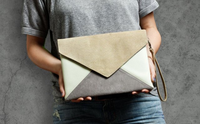 Torebka typu kopertówka została wykonana z eko-skóry w kolorze kości słoniowej oraz beżowego i szarego eko-zamszu.