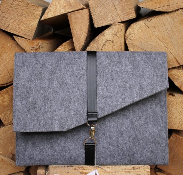 Teczka lub kopertówka,wykonana z filcu. Ozdobiona czarnym paskiem, zapinana na karabińczyk. Po zakupie proszę podać wymiary.