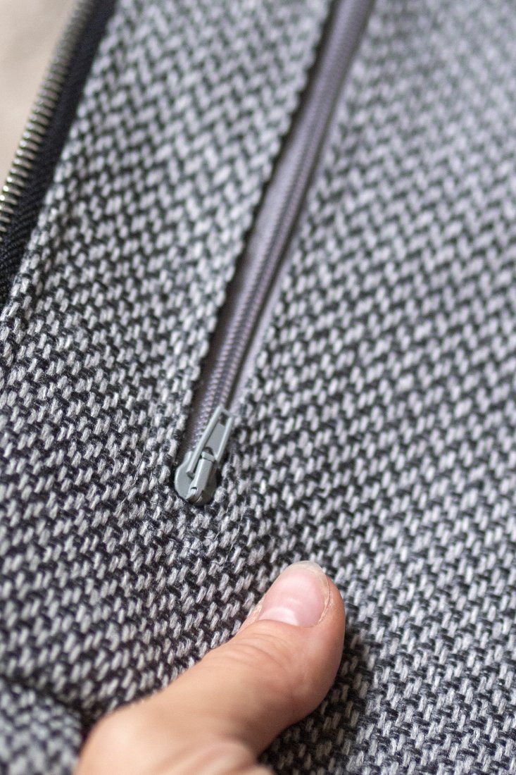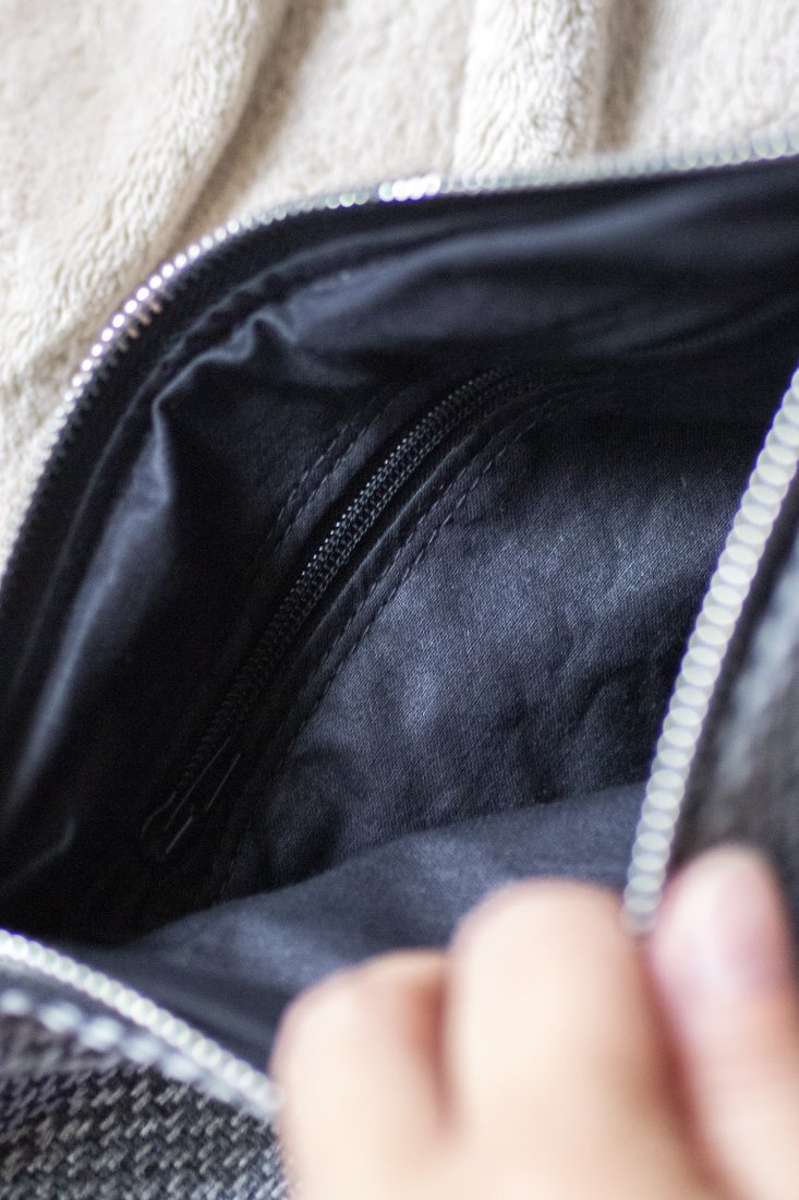 Małe zaszewki na dnie. Z tyłu oraz w środku torebki kieszonki zapinane na suwak. Środek wykończony bawełnianą podszewką.