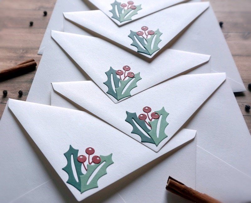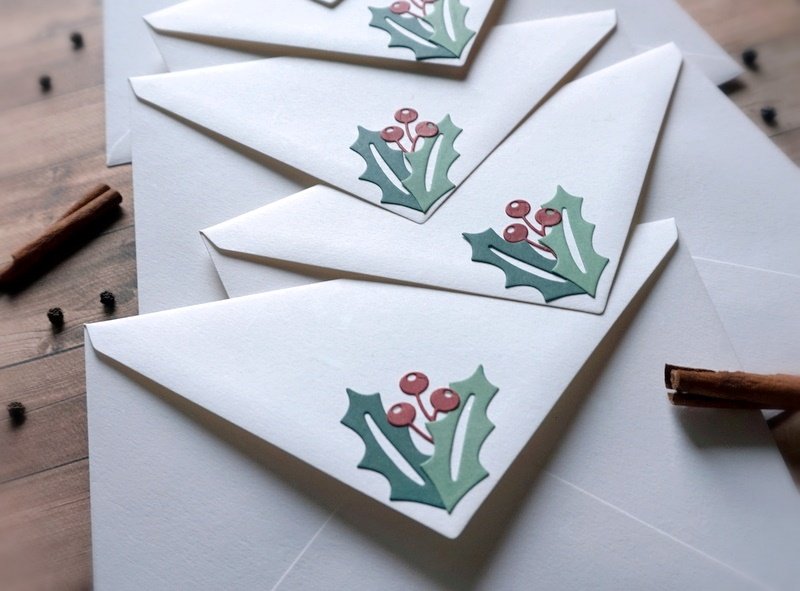 - Na froncie koperty umieściłam gałązkę jemioły, na zamknięciu - kompozycję ostrokrzewu.