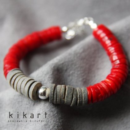 Muszla szara (10mm) w połączeniu z koralem czerwonym. Dodatki ze srebra próby 925. Długość bransoletki regulowana: ok. 19-21cm. Polecam :)