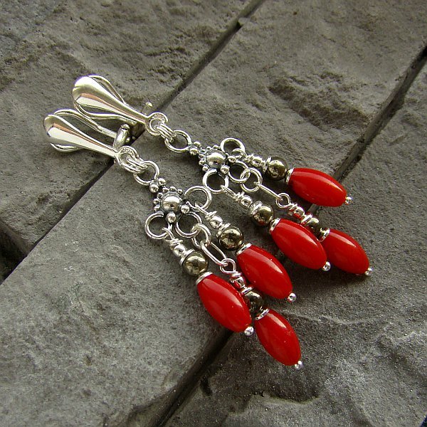 Kobiece, eleganckie i oryginalne klipsy na co dzień i nie tylko. Wykonane w całości ze srebra próby 925 oraz oliwek czerwonego korala wielkości 10 mm i 4 mm kulek pirytu, Zapięcia klipsów również srebrne i wygodne. Długość bez zapięć to 4,5 cm, Ozdobnie zapakowane.