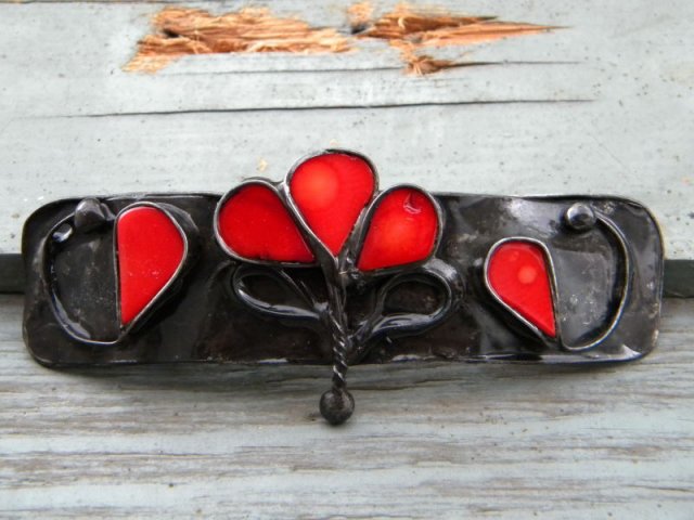 klamra do włosów z korala w ocynowanej miedzi.wymiary ekstremalne 9,8cm x 4cm.spinka jest lekka, wykończenie błyszczącym werniksem, który zabezpieczy czerń oksydy przed ścieraniem.