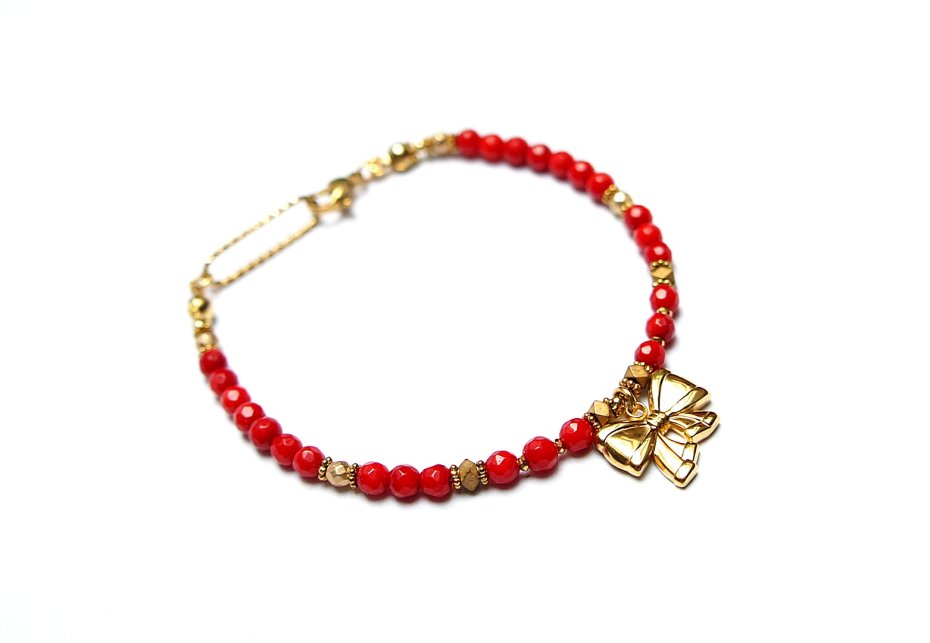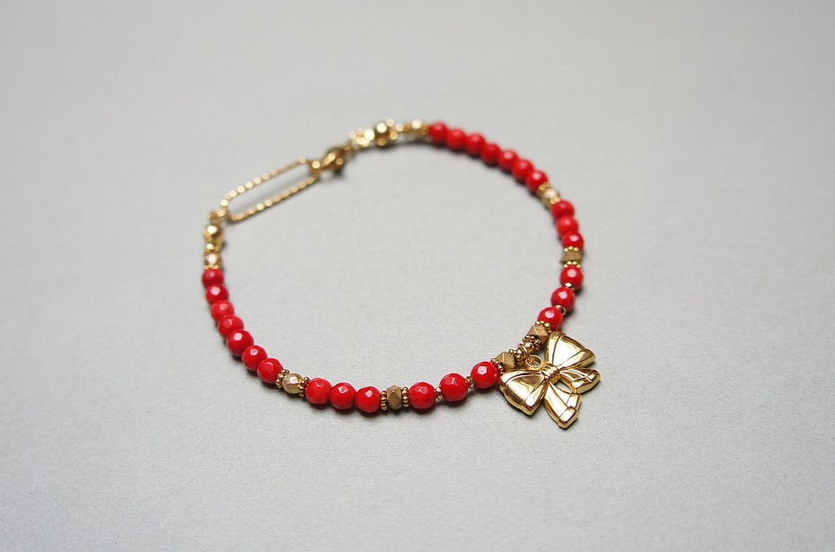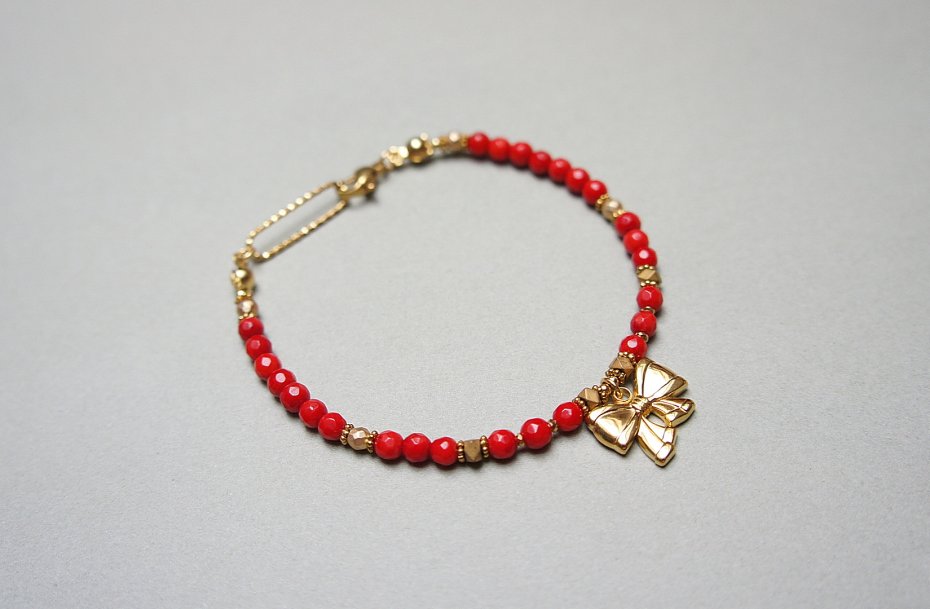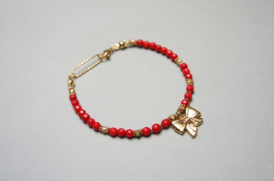 Bransoletka wykonana w całości z pozłacanej stali szlachetnej oraz naturalnych, szlachetnych kamieni - koral naturalny [3mm], hematyt fasetowany, platerowany [3mm], przekładek z hematytu [1mm, 3 x 2mm]. Bransoletka o długości ok. 19,5cm. Biżuteria ozdobnie zapakowana.