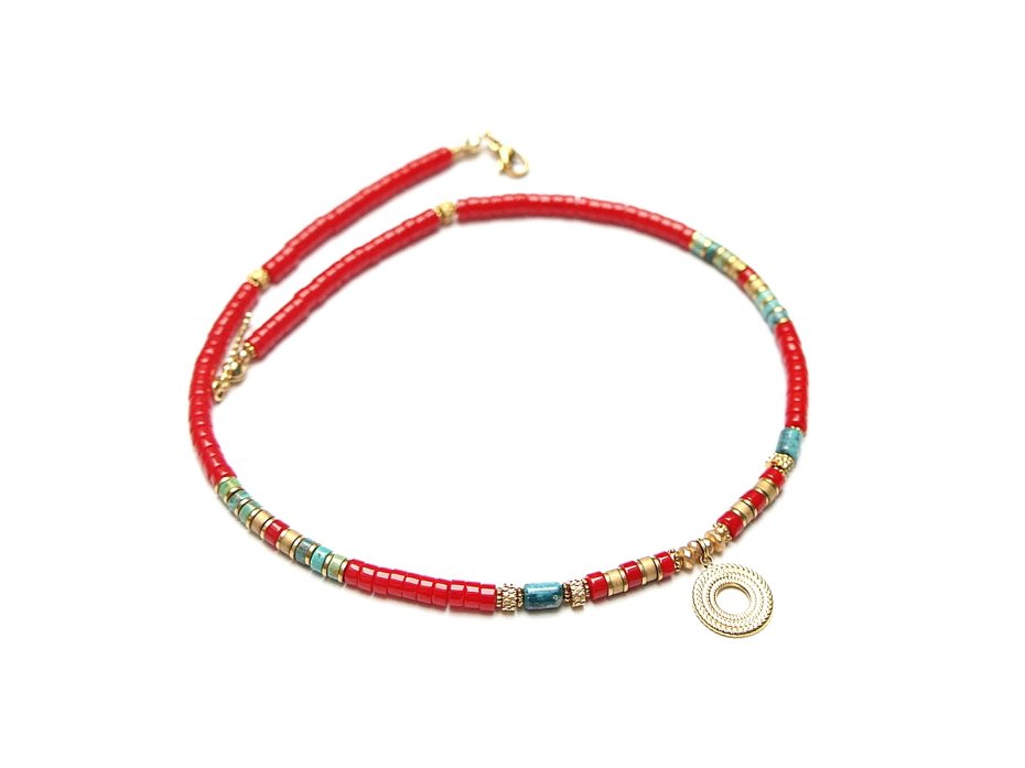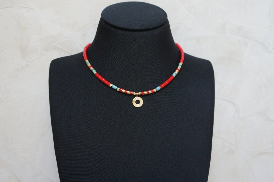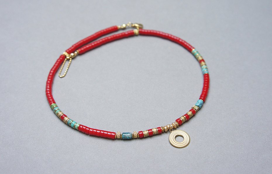 Krótki, delikatny naszyjnik wykonany w całości z pozłacanej stali szlachetnej oraz naturalnych kamieni - talarków korala [4 x 2mm], talarków matowego hematytu [4 x 2mm], wałeczków naturalnego turkusu [ok. 6 x 4mm], hematytu fasetowanego, platerowanego [4 x 2mm i 2mm]. Naszyjnik o długości ok. 42,5cm. Biżuteria ozdobnie zapakowana.