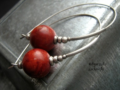 Kolczyki wykonane z oksydowanego srebra oraz korala wielkości 12 mm. Długośc kolczyków - 4,7 cm.