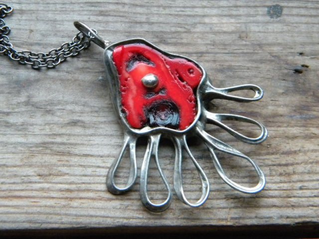 wisior z korala oprawionego w ocynowaną miedz, stylizowany na stare srebro.