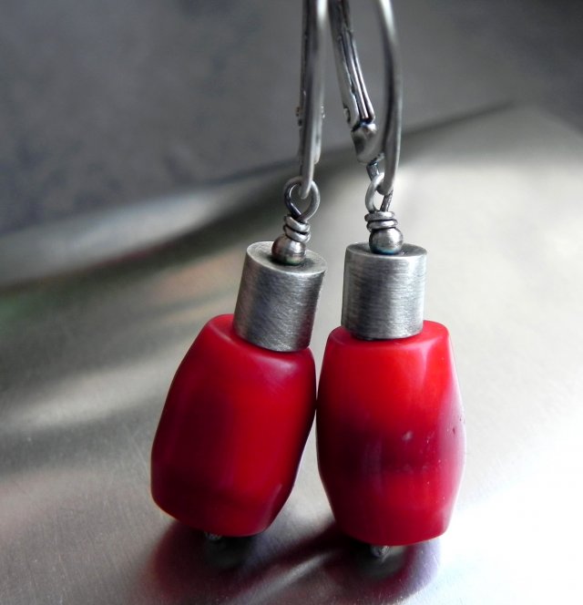 Kolczyki wykonane zostały ze srebra próby 925, oksydowanego i przetartego oraz wałeczków korala wielkości 15 mm. Długość całkowita kolczyków wynosi 4,5 cm.