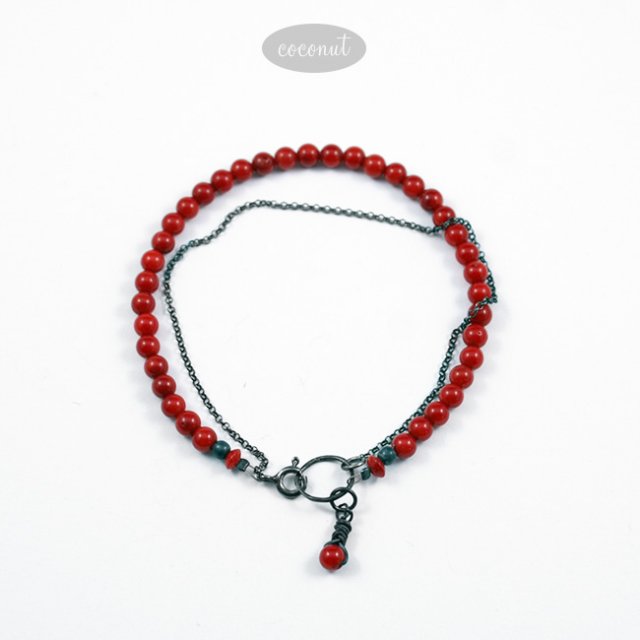 Bransoletka na lince stalowej, elementy ze srebra (oksydowane), naturalny czerwony koral, obwód ok. 18,2-18,6 cm.
