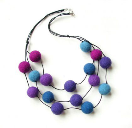 Korale wykonane z własnoręcznie filcowanych kulek z naturalnej, wysokiej jakości wełny z merynosów australijskich na czarnym sznurku woskowanym, zapięcie typu karabińczyk. Długość korali: ok. 52,5cm. Średnica największej kulki: ok. 2,1cm. Kolory: odcienie fioletu i niebieskiego.