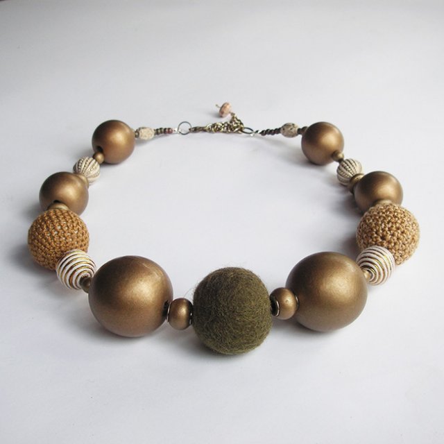 Kolory to matowe stare złoto, khaki, oraz kremowy (waniliowy) ze złotym . Po środku duża filcowa kula w kolorze oliwkowym (khaki) . Długość korali ok. 60cm, regulowana ( zapięcie na karabińczyk, z łańcuszkiem, w kolorze starego złota)