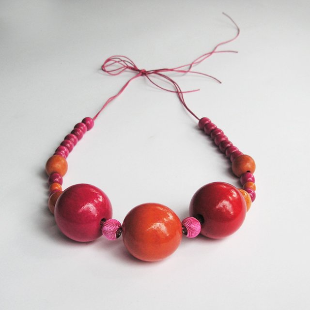 Oryginalne korale w kolorystyce pink + oranż, ostre kolory, wg aktualnej mody , składają się z kulek drewnianych . Centralnie trzy duże kule o średnicy 40 mm stanowią ostry element kolorystyczny . Korale nawleczone są na woskowany sznurek jubilerski w kolorze różowym, przeznaczony do zawiązania na szyi .Długość naszyjnika regulowana – ca od 50 cm do 60 cm, zależnie jak ciasno zawiążemy korale na szyi.