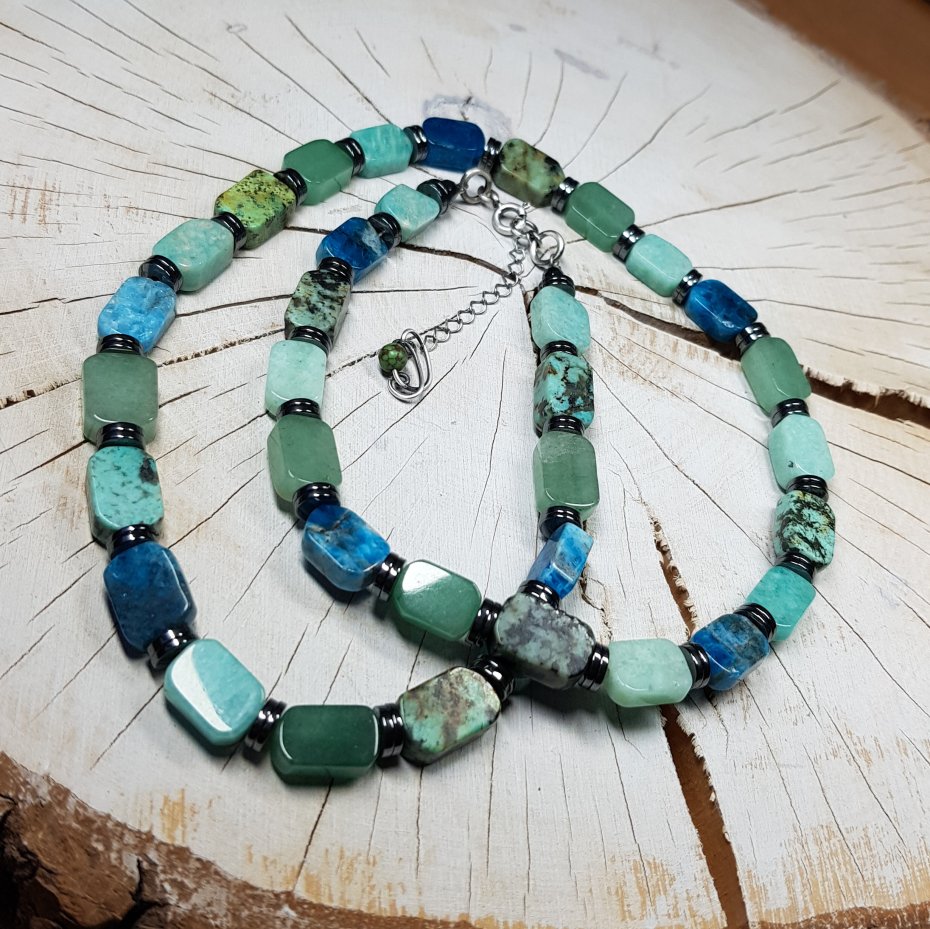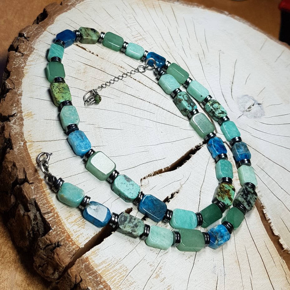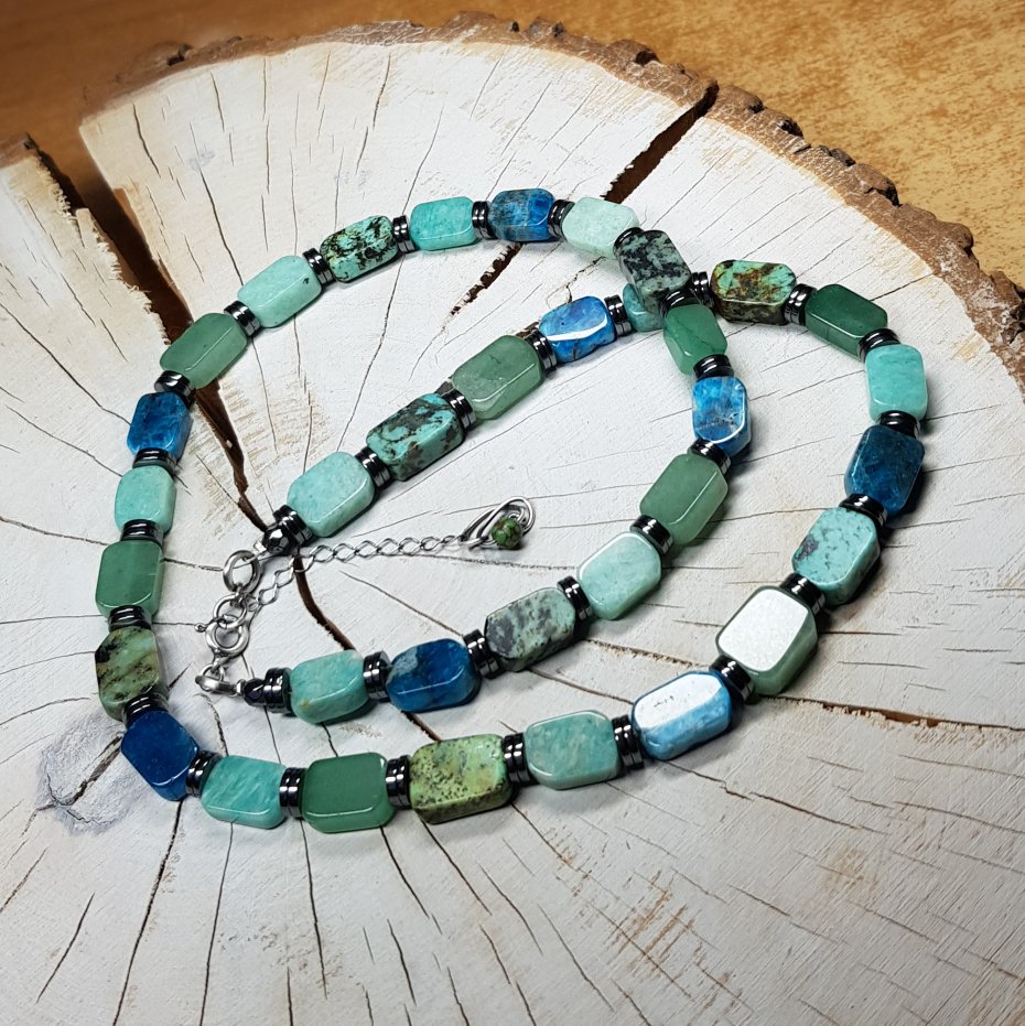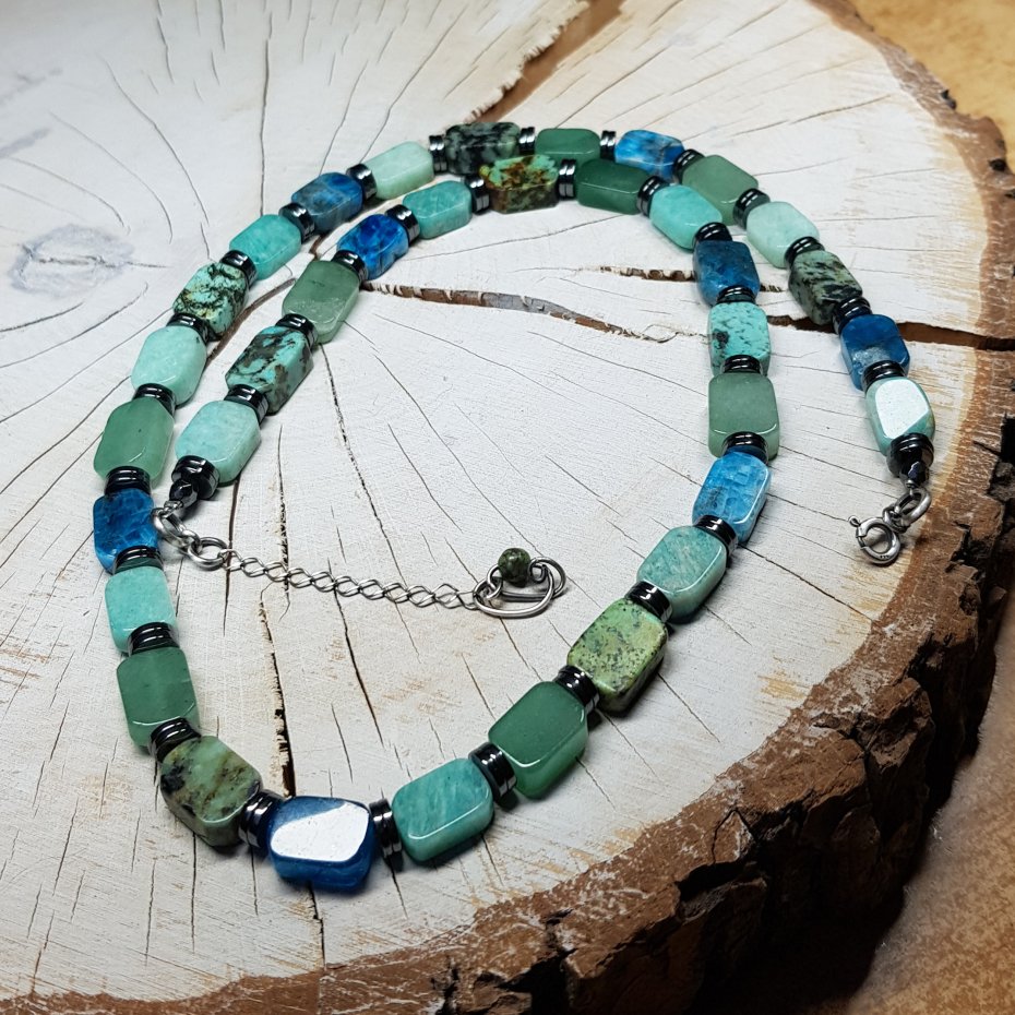 Sznur korali wykonany ręcznie z naturalnych prostokątnych około 8x12mm kamieni szlachetnych - turkus, amazonit, apatyt, prehnit, chalcedon. Kamienie naturalne po oszlifowaniu mogą mieć ryski, wgłębienia, inkluzje, odpryski i nie jest to ich wadą. Zapięcie i łańcuszek wykonane w srebrze, które zostało przyczernione oksydą i wypolerowane. Długość korali wynosi ok. 55cm plus przedłużka 3,5cm.