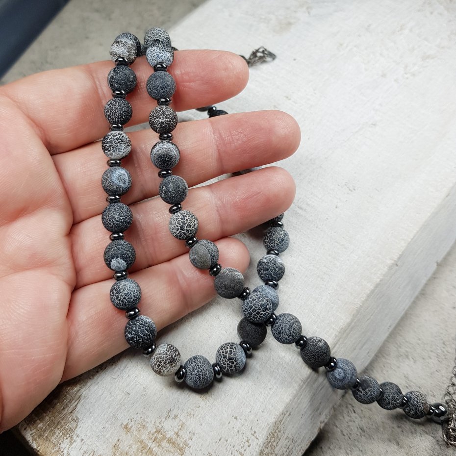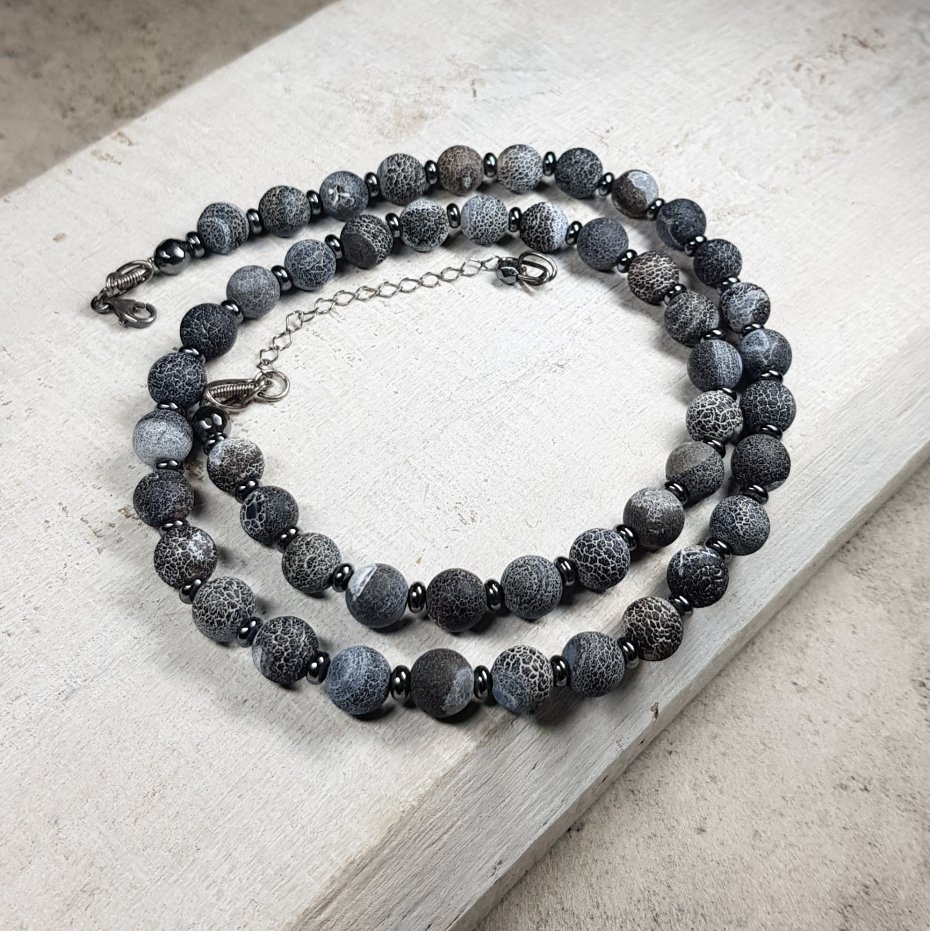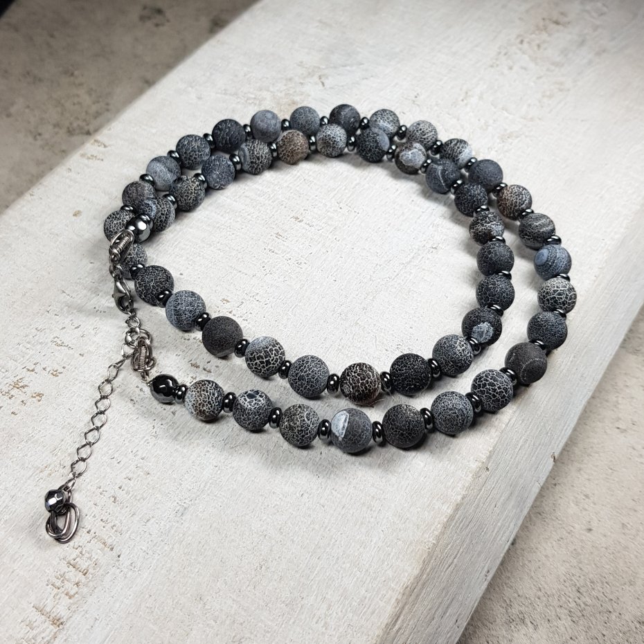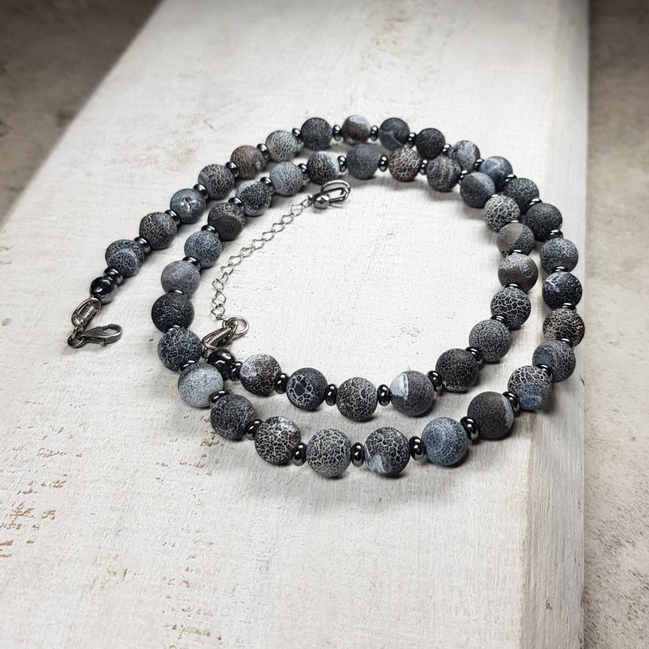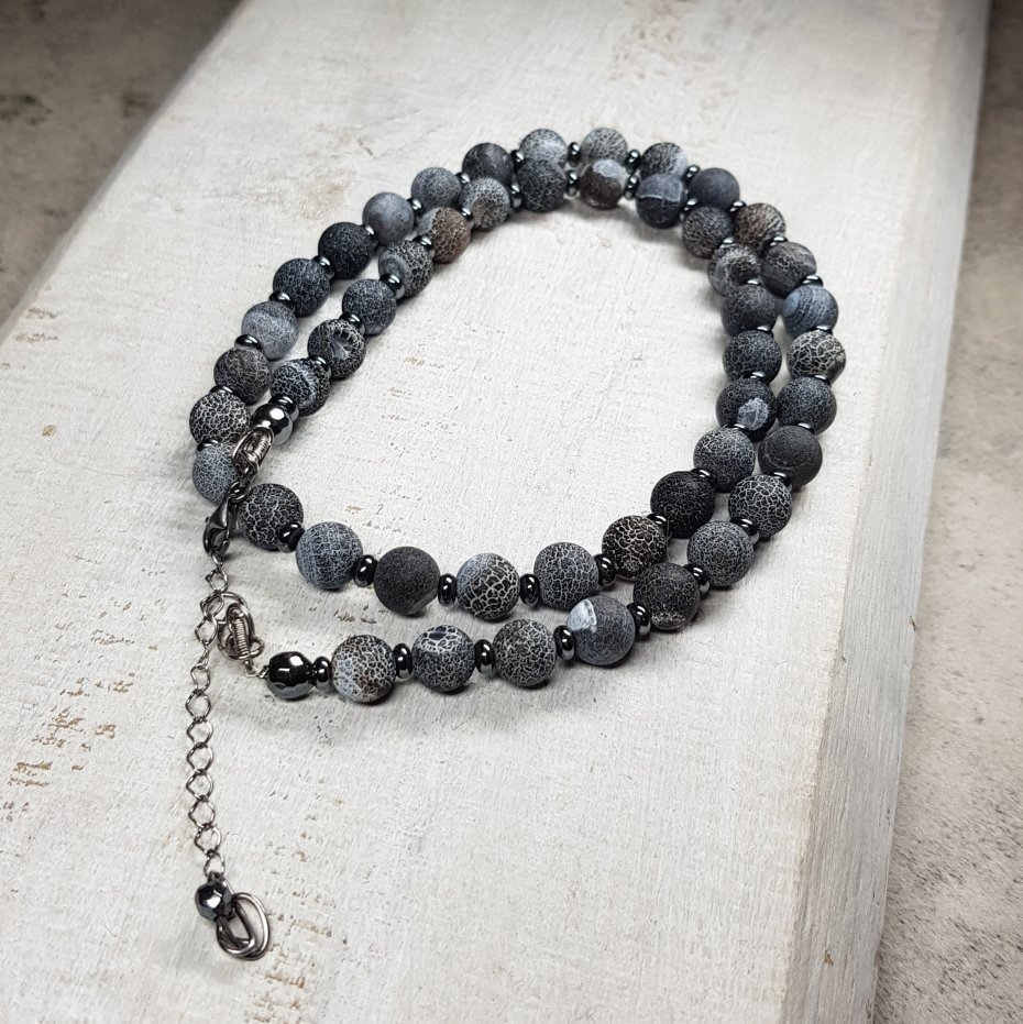 Sznur korali wykonany z kulek 8mm agatu dragon matowego i przekładek hematytu w ciekawej mieszance popielatych kolorów sprawiających wrażenie spękanych. Zapięcie wykonane w srebrze 999 i 925.