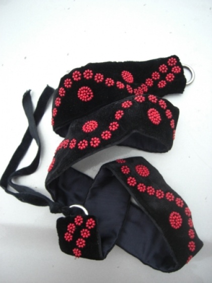 Ręcznie szyty i wyszywany czerwonymi koralikami aksamitny pasek. Wiązany na aksamitkę. Szerokość 3,5 cm. Długość 79 cm. Stan bardzo dobry.