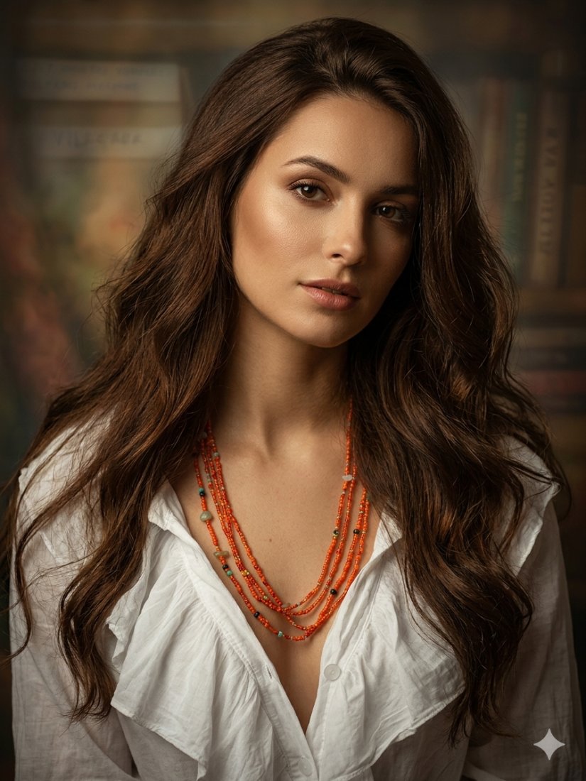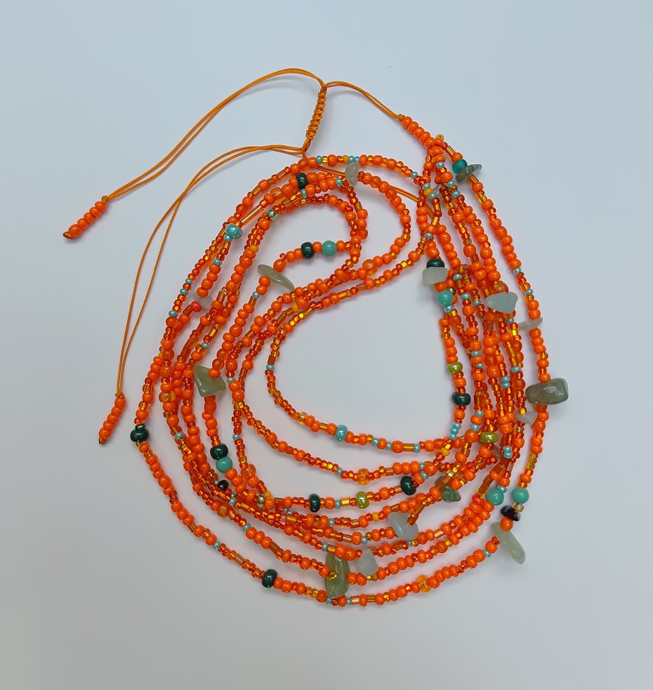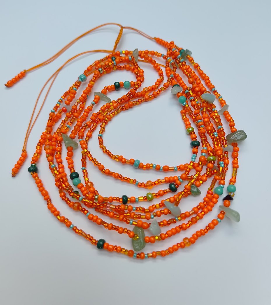 Ożyw swoją stylizację dzięki temu ręcznie wykonanemu naszyjnikowi kaskadowemu. Składa się on z pięciu pasm maleńkich, pomarańczowych koralików, ozdobionych nieregularnymi kawałkami zielonego jadeitu. Ta delikatna, a zarazem efektowna biżuteria doda odrobinę koloru i naturalnego uroku każdemu strojowi, od casualowych bluzek po eleganckie sukienki.