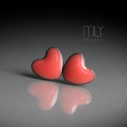 Ceramiczne kolczyki w formie sztyftów, ręcznie wykonane z delikatnej gliny kamionkowej, jednostronnie szkliwione różowo czerwonym szkliwem w odcieniu koralowym o subtelnym połysku, na antyalergicznych sztyftach w kolorze srebrnym..Średnica ok. 12mm.. Polecam