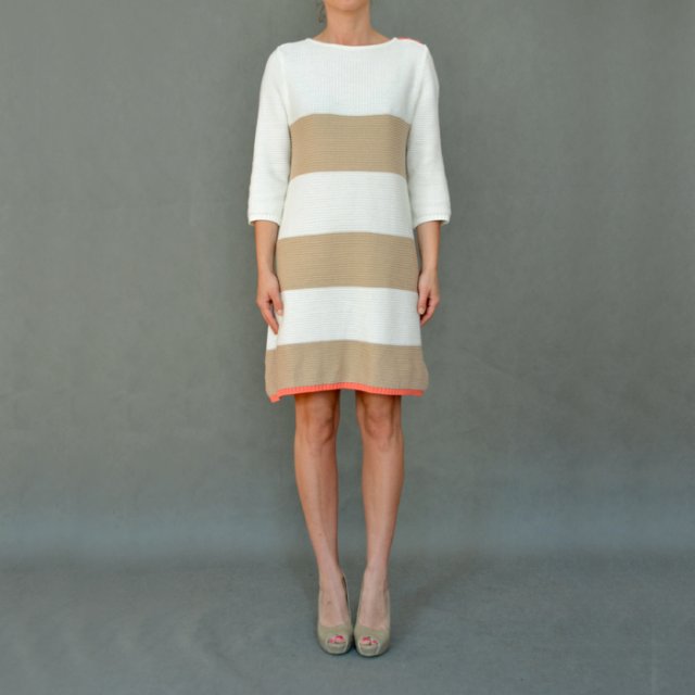 Śliczna, sweterkowa sukienka w białe i beżowe pasy. Wykończona koralową lamówką na dole i guziczkami na ramieniu z jednej strony. Idealna na chłodne, letnie wieczory. Polecam bardzo.