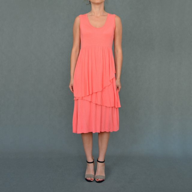 Sukienka w kolorze koralowego różu. Z ukośnymi falbanami. Dół i falbany surowo cięte. Marka BLUE FOREST.