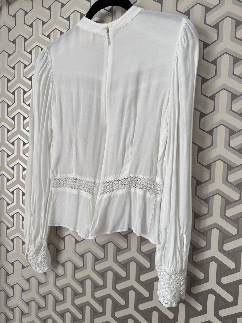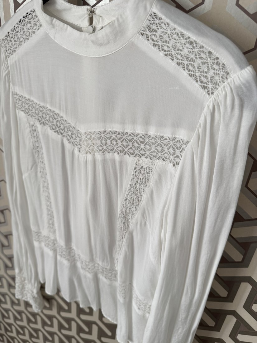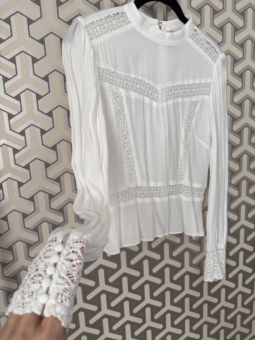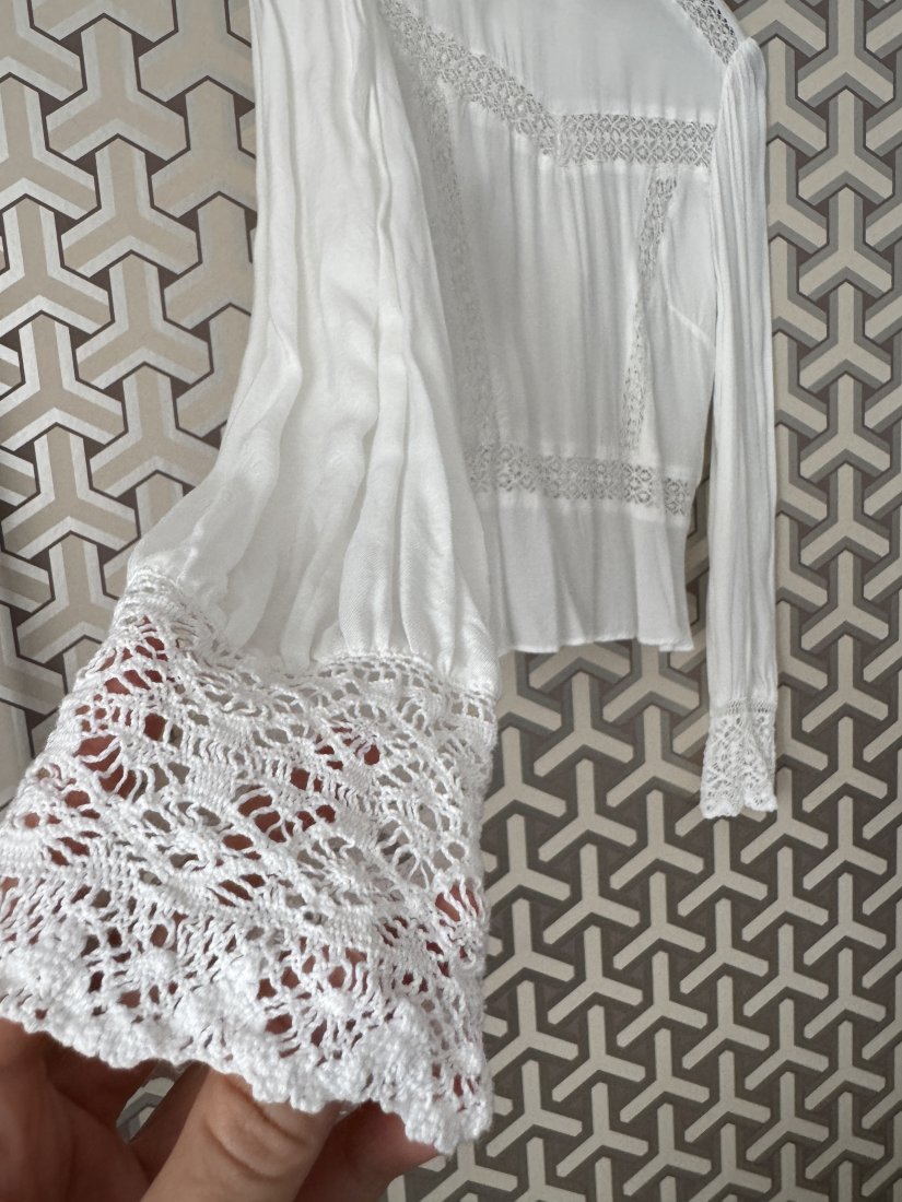 Delikatna, elegancka biała bluzka z koronkowymi wstawkami, małymi bufkami i pięknymi mankietami z koronki i guziczkami. Metka jest odcięta, ale to na pewno 100% bawełny, a może bawełna z wiskozą.