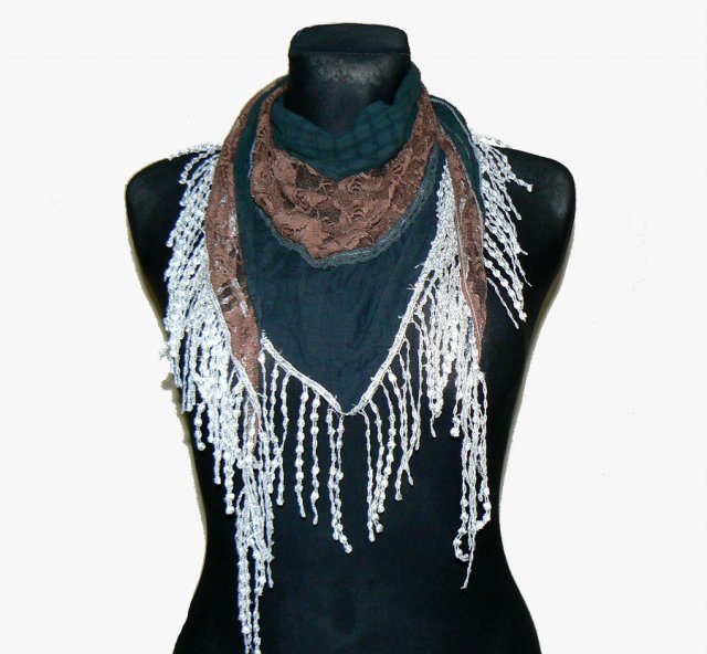Delikatna trójkątna chusta uszyta z połączenia granatowej bawełnianej tkaniny i brązowej koronki. Dolne brzegi wykończone długimi białymi frędzlami z gipiurowej taśmy.