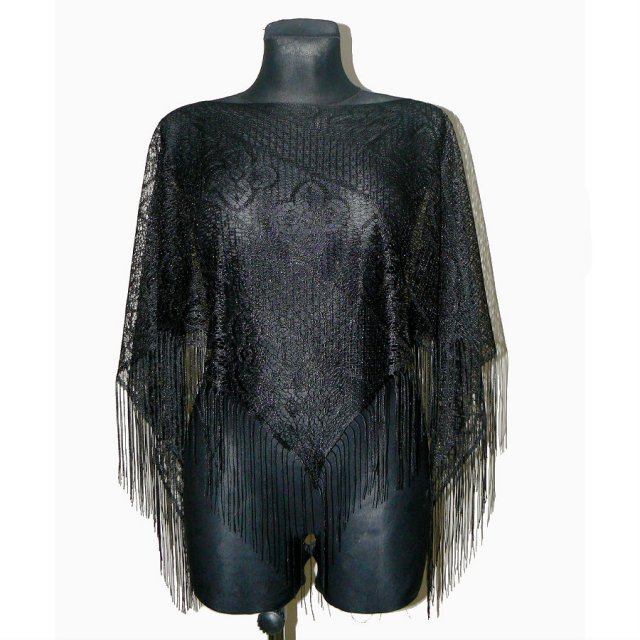 Czarna narzutka z gładkiej koronki, wykończona długimi frędzlami. Będzie świetnie wyglądać na sukience, kostiumie kąpielowym czy gładkim topie.