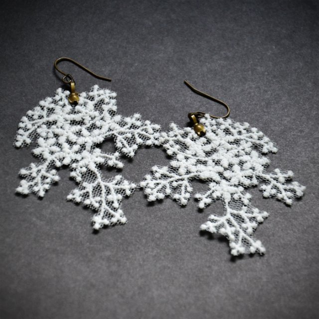 Delikatne kolczyki wykonane zostały z białej bawełnianej koronki oraz metalowych elementów w kolorze antycznego brązu. Koronka została usztywniona. Długość kolczyków wraz z metalowymi elementami 7 cm.
