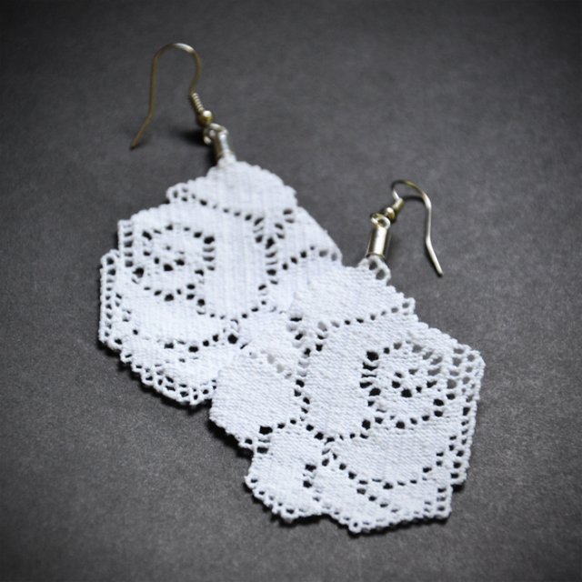 Delikatne kolczyki wykonane zostały z białej bawełnianej koronki oraz metalowych elementów w kolorze srebrnym. Koronka została usztywniona. Długość kolczyków wraz z metalowymi elementami 7,3 cm.