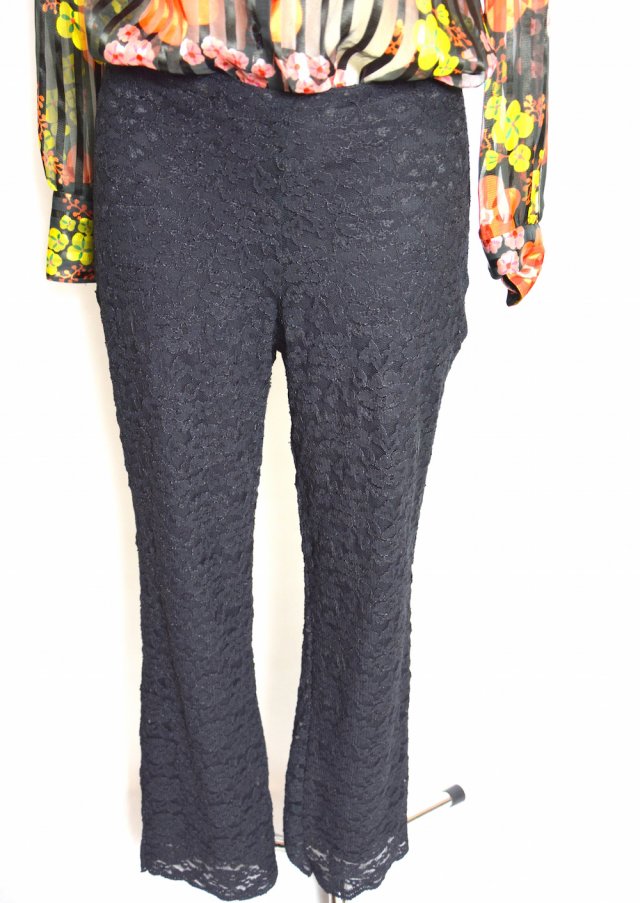 Czarne grubsze koronkowe spodnie marki Fransa o prostej nogawce, spodnie w pasie na gumce i dodatkowo zasuwane z boku na suwak. Wierzchnia część to koronka, od spodu są nie prześwitujące.