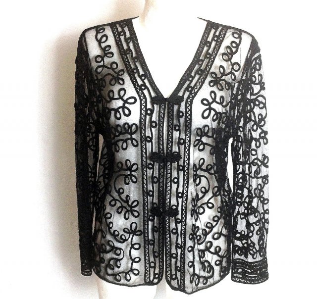 Śliczny koronkowy blezer o luźniejszym kroju , ciekawie zapinany (fot nr 2), wyszywany czarną taśmą , dodatkowo wysadzany czarnymi małymi kamyczkami. Jest oczywiście elastyczny.