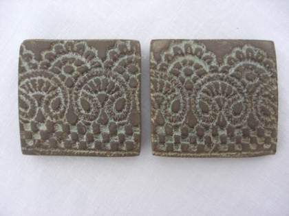 Zestaw dwóch ręcznie formowanych magnesików ceramicznych z wzorem odciskanej koronki. Ze szlachetnej brązowej gliny. Matowe. Wzór lekko perłowo błyszczący; rozbielona szmaragdowa zieleń. Wymiary: 5 x 4,5 cm i 4,7 x 4,5 cm. Magnesiki mają po 1,5 cm średnicy.