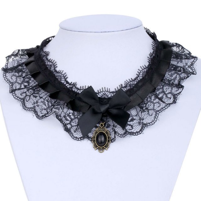Czarny naszyjnik niczym z babcinego kufra, uszyty z koronki i tasiemki. Ozdobiony zawieszką w kolorze starego złota z czarnym oczkiem.