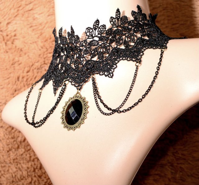 Czarny naszyjnik niczym z babcinego kufra, uszyty z miękkiej koronki. Ozdobiony łańcuszkami i dużym medalionem z czarnym oczkiem. Pięknie prezentuje się na szyi.