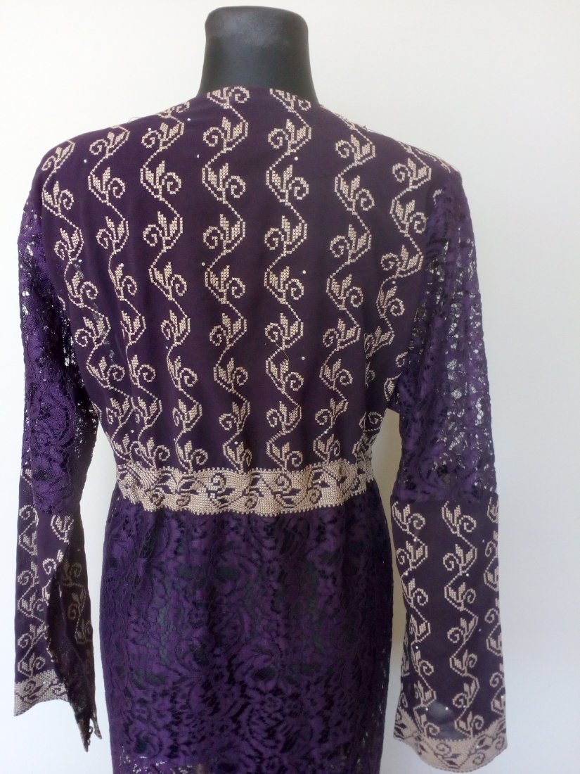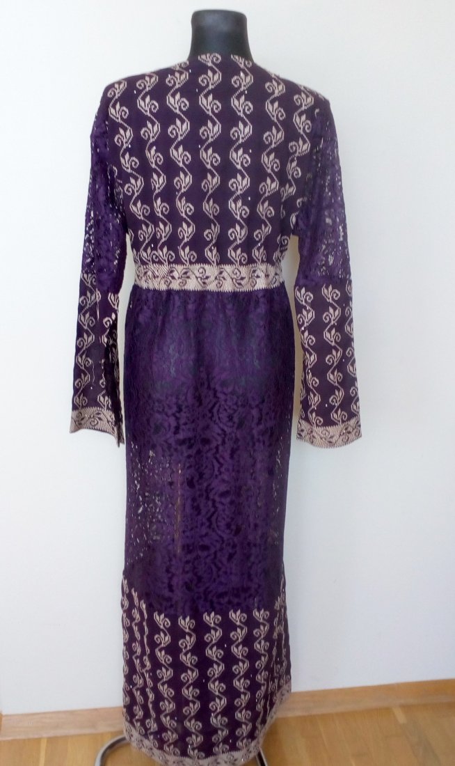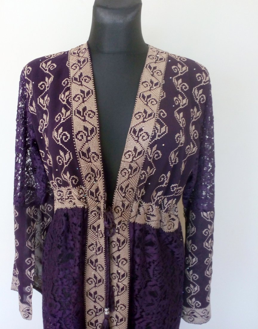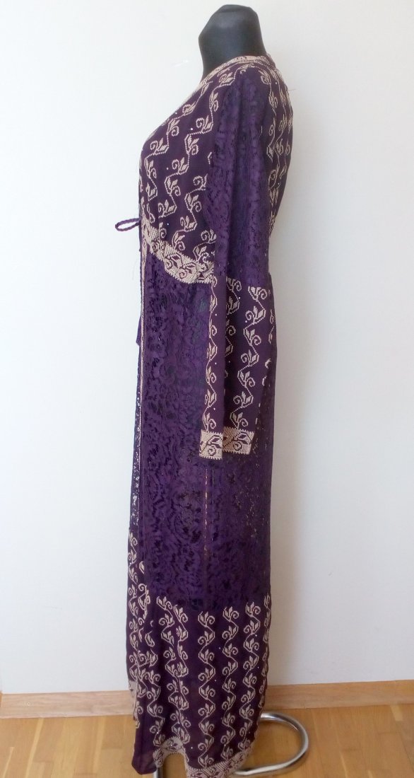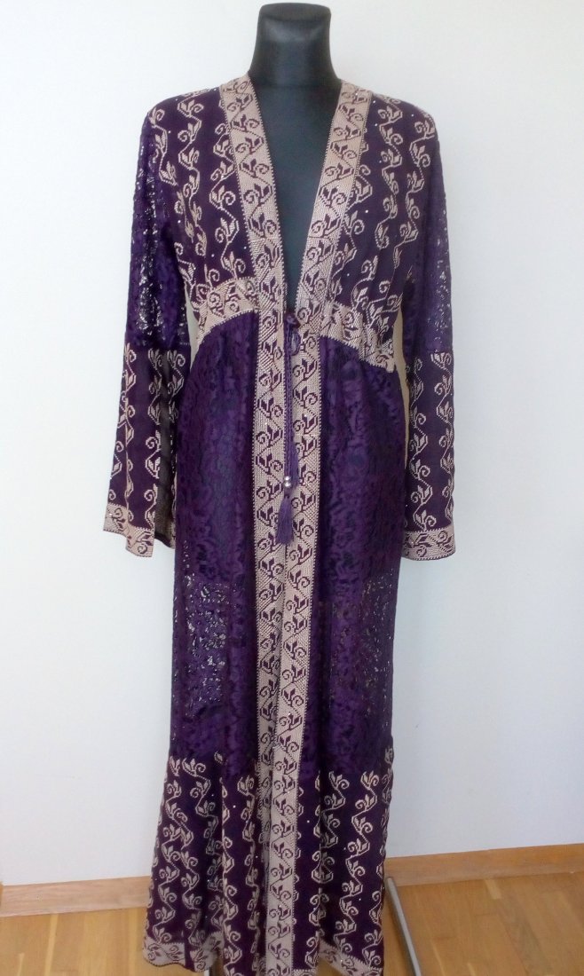 Unikatowy maxi płaszcz z koronki w oberżynowym kolorze z beżowymi wzorami, gdzieniegdzie malutkie białe cyrkonie, ściągany sznurkiem z ozdobnymi chwostami, rękaw od łokcia do dołu rozcięty od wewnętrznej strony, płaszcz bez podszewki, bardzo ladnie się prezentuje