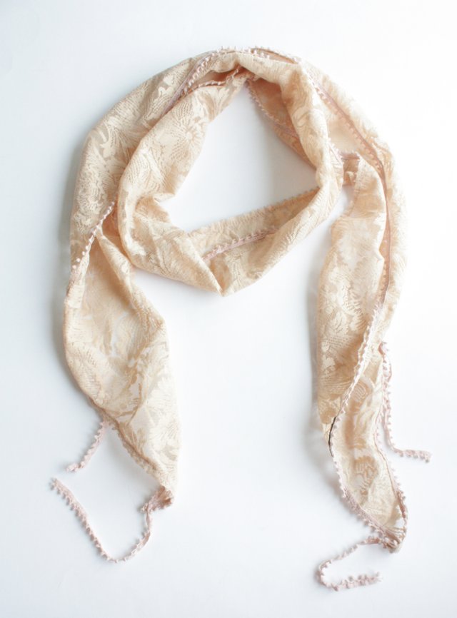 Jasnobeżowy szal z subtelnej koronki, o ciekawie wykończnych brzegach.