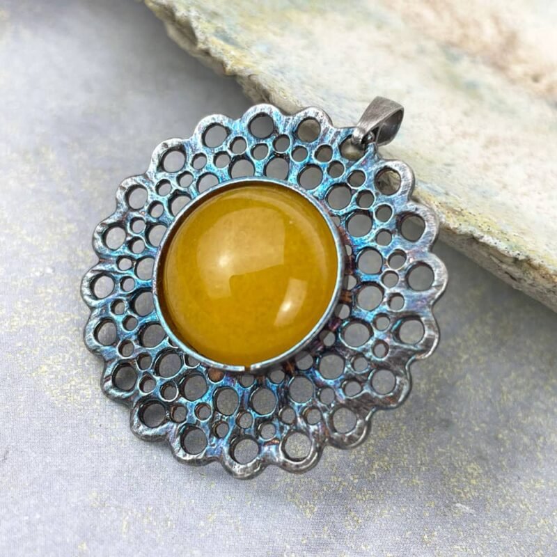 Wisior ze srebra próby 925 jest inspirowany delikatnymi strukturami koronki. W środku okrągłej formy wykonanej techniką metaloplastyki znajduje się jadeit w odcieniu sierpniowego słońca o średnicy 15 milimetrów. Srebro, na skutek procesu oksydowania i przecierania mieni się, dodając wisiorowi niepowtarzalnej poświaty. Ażurowa struktura naszyjnika jest bogata w detale, które urozmaicą klasyczną lub minimalistyczną stylizację. Będzie również trafionym prezentem dla bliskiej osoby, która ceni sobie oryginalne dodatki na co dzień.