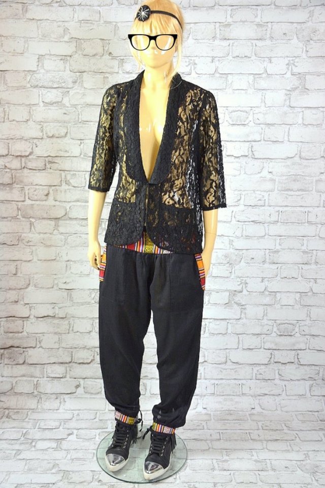 Luźna koronkowa marynarka/narzutka o otwartym fasonie z długim efektownym kołnierzem, z przodu głębsze kieszonki, rękaw za łokieć.
