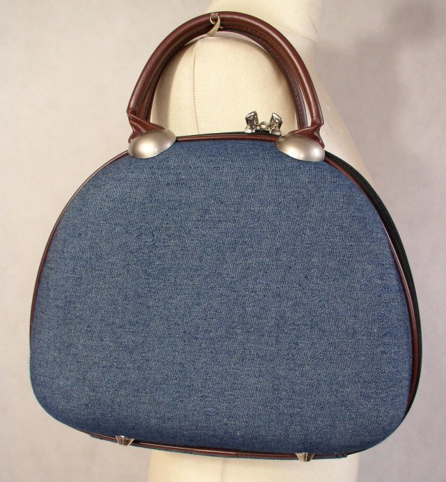Duża,sztywna kosmetyczka.Zapinana na zamek.Dwie rączki do noszenia w ręku.Na spodzie cztery metalowe nóżki.W środku po jednej stronie skrzyżowana taśma,po drugiej część przypięta na rzep z lusterkiem i marszczoną kieszonką.Stan bardzo dobry.Wysokość 25 cm.szerokość 37 cm.mierzona do zamków,rączki 29 cm.