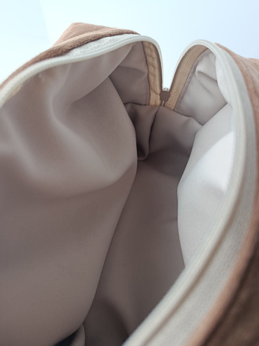 Z zewnątrz brązowy welur, środek beż