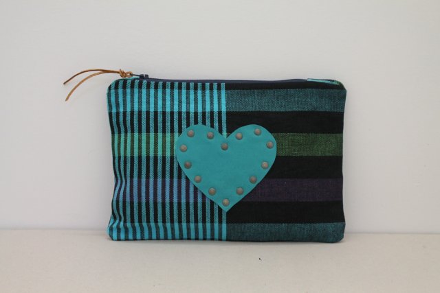Kosmetyczka/saszetka wykonana z mocnej,bawelnianej tkaniny oraz skory naturalnej( serce). Saszetka zapina sie na zamek. Wymiary: 17x25cm . Termin realizacji zamówienia to 1-2 dni.