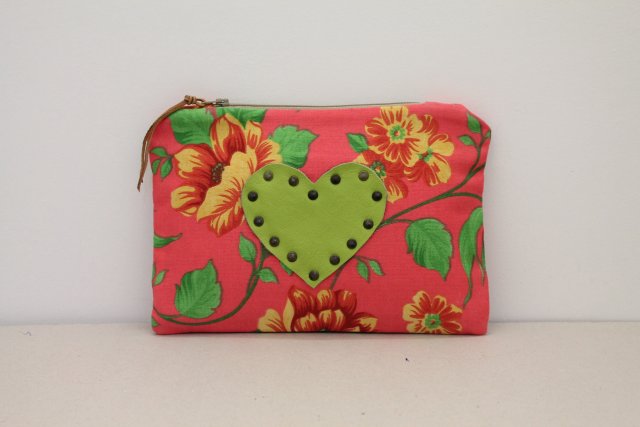 Kosmetyczka/saszetka wykonana z mocnej,bawelnianej tkaniny oraz skory naturalnej( serce). Saszetka zapina sie na zamek. Wymiary: 17x25cm . Termin realizacji zamówienia to 1-2 dni.