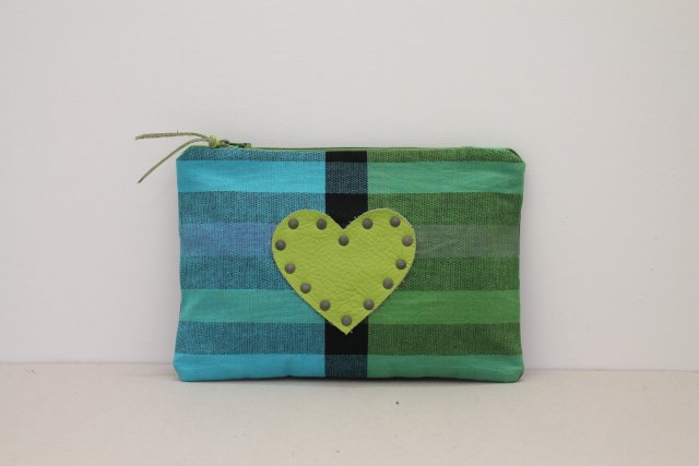 Kosmetyczka/saszetka wykonana z mocnej,bawelnianej tkaniny oraz skory naturalnej( serce). Saszetka zapina sie na zamek. Wymiary: 17x25cm . Termin realizacji zamówienia to 1-2 dni.