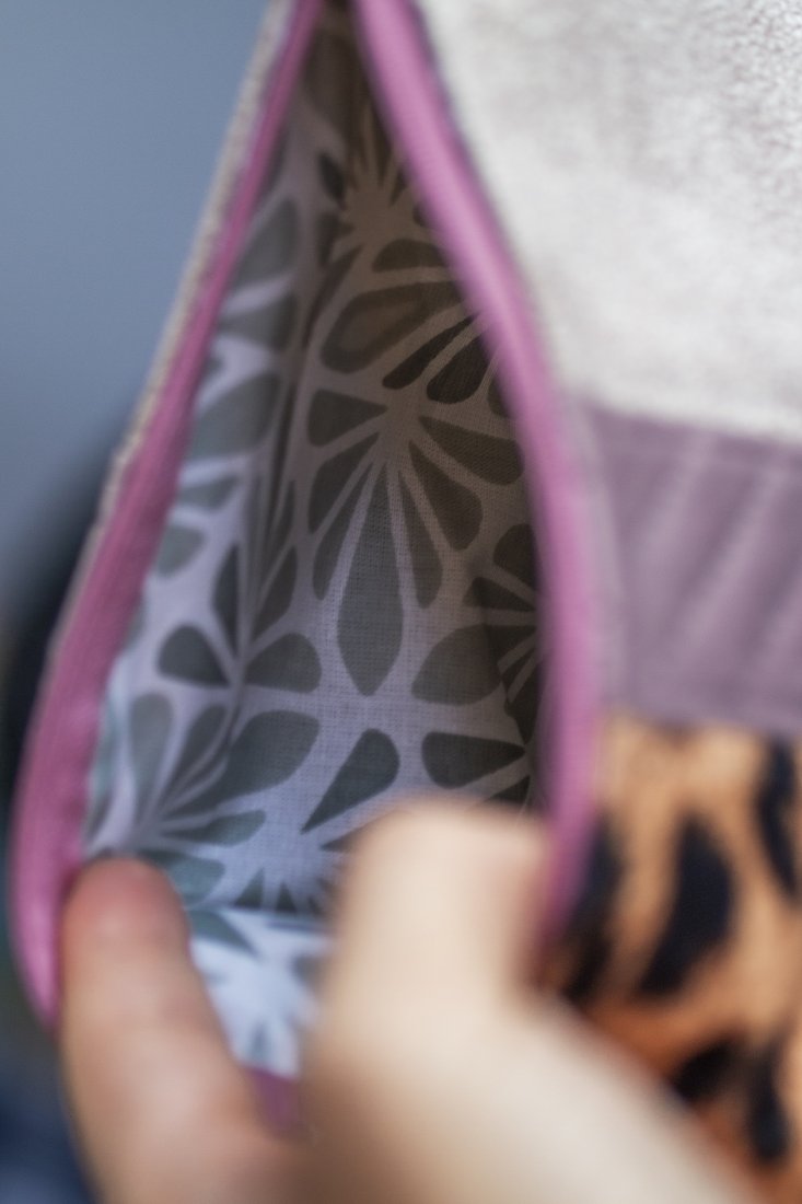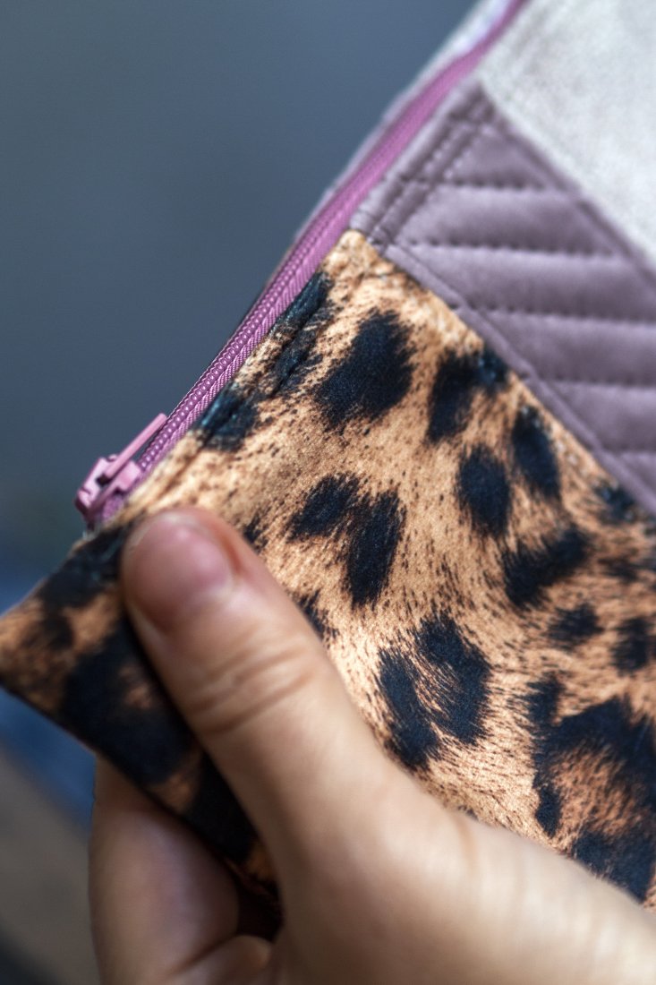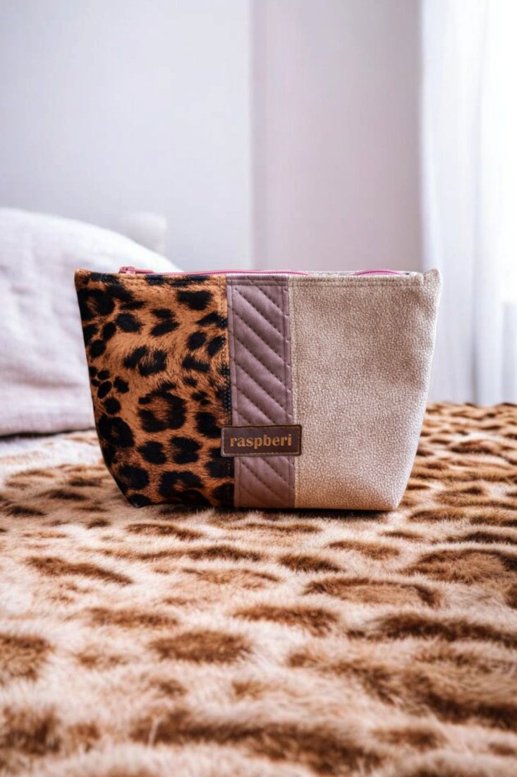 Duża kosmetyczka z weluru w panterkę i beżowego weluru oraz pikowanego weluru w kolorze pudroworóżowym. Bardzo przyjemna w dotyku. Wykonana w duchu no waste.
